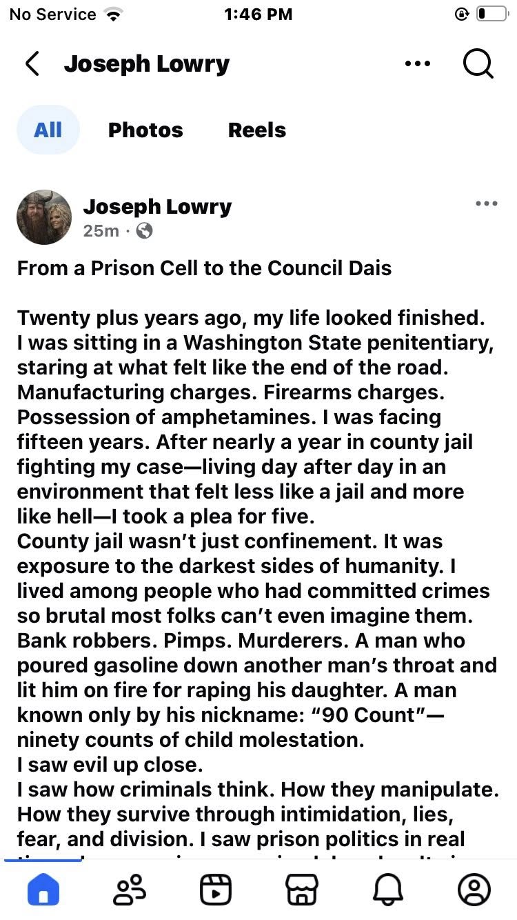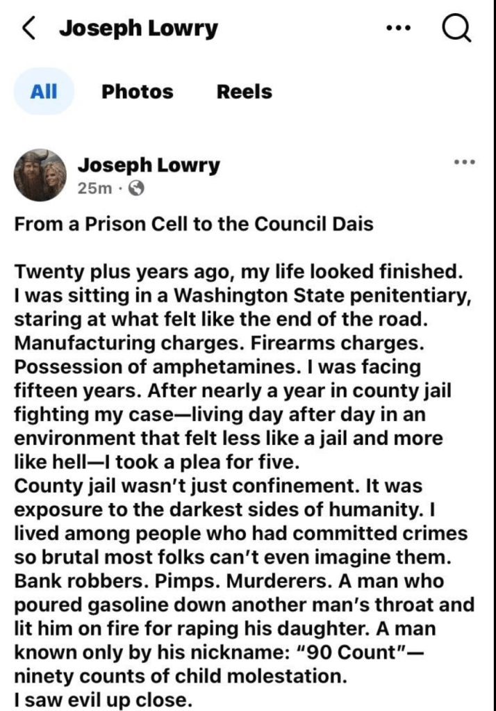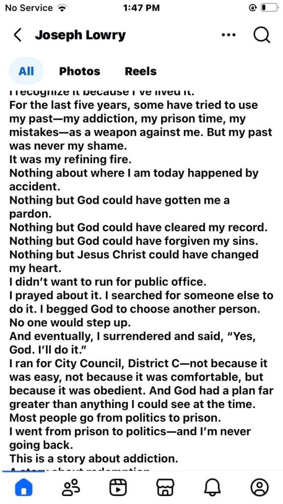 Lowry has a long, long history of doing all of the above including making false DBAs for Council Member and one of his favorite targets. But all of a sudden Lowry’s behavior has changed and he is on a pity me tour. His “Lowry News Network” website has gone cold. He was on his best behavior acting like a productive member of the City Council at the last meeting. And just recently he posted an AI generated “Oh pity me I’m born again” post on Facebook. It’s typical behavior when something or someone has legally slapped the hell out of him.