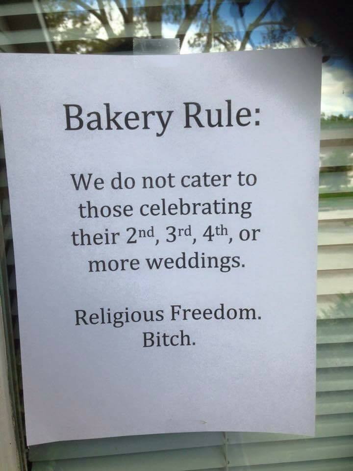 The bakers who are claiming “Religious freedom” to deny building a cake for a gay couple are hypocrites. They have no problem building a cake for those who are repeat wedding planners. The issue has nothing to do with religion. Nothing. It has everything to do about being a dick.