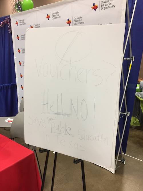 The School Vouchers group is cleverly named “School Choice” and they dishonestly advocate for better education. What they don’t tell you is that they are advocating for better education with school vouchers. They figured out that vouchers is a bad word especially with a group of people who support our families, friends, and educators who are in the public school system. They left their material on the table for people to take. Someone took the opportunity to write them a note.