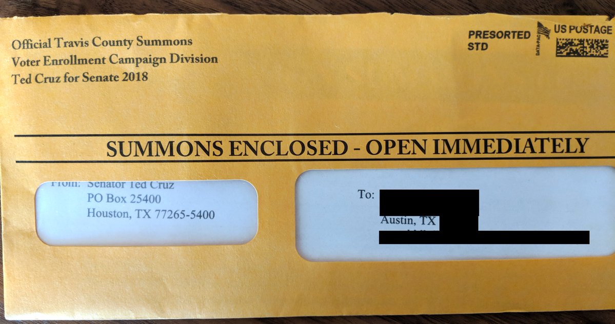 “Received this for my 88-year-old grandma,” Owen said in his post, which also shared a photo of the envelope. “Says it’s a summons from Travis County, but is actually for money for @tedcruz. Did your campaign authorize this? Is this even legal? Shame on you. That’s one more @BetoORourke voter.”