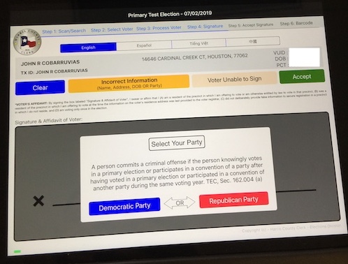 The new process is operated by both parties, sitting side by side. There are no different lines for different parties. Everyone, just like in general voting, stands in the same line. Once they check in they will be asked to select which party they intend to vote in. (see pic below) This choice is presented to the voter on the iPad. The ballot is presented to the voter at the voting booth based upon the party choice.