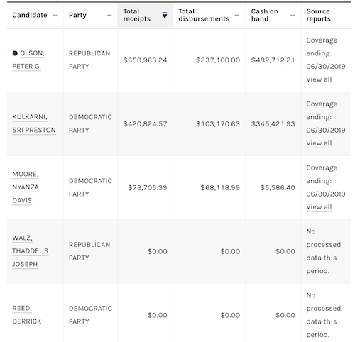 Olson has $482,712 COH and Kulkarni has $345,421. Nyanza Moore, who is challenging Kulkarni in the primary raised $73,705 with $5,586 COH. There are a couple of fringe candidates that have no idea what they are doing.