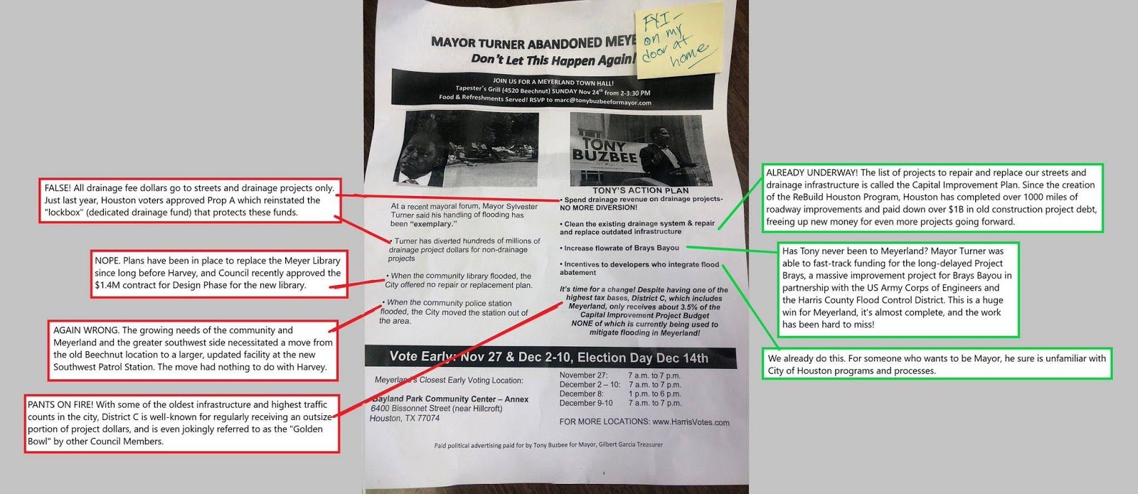 Buzbee has plastered Meyerland with the following poorly designed flyer. Click on the pic below to read the fact checks by a Meyerland resident. Thanks to Art!