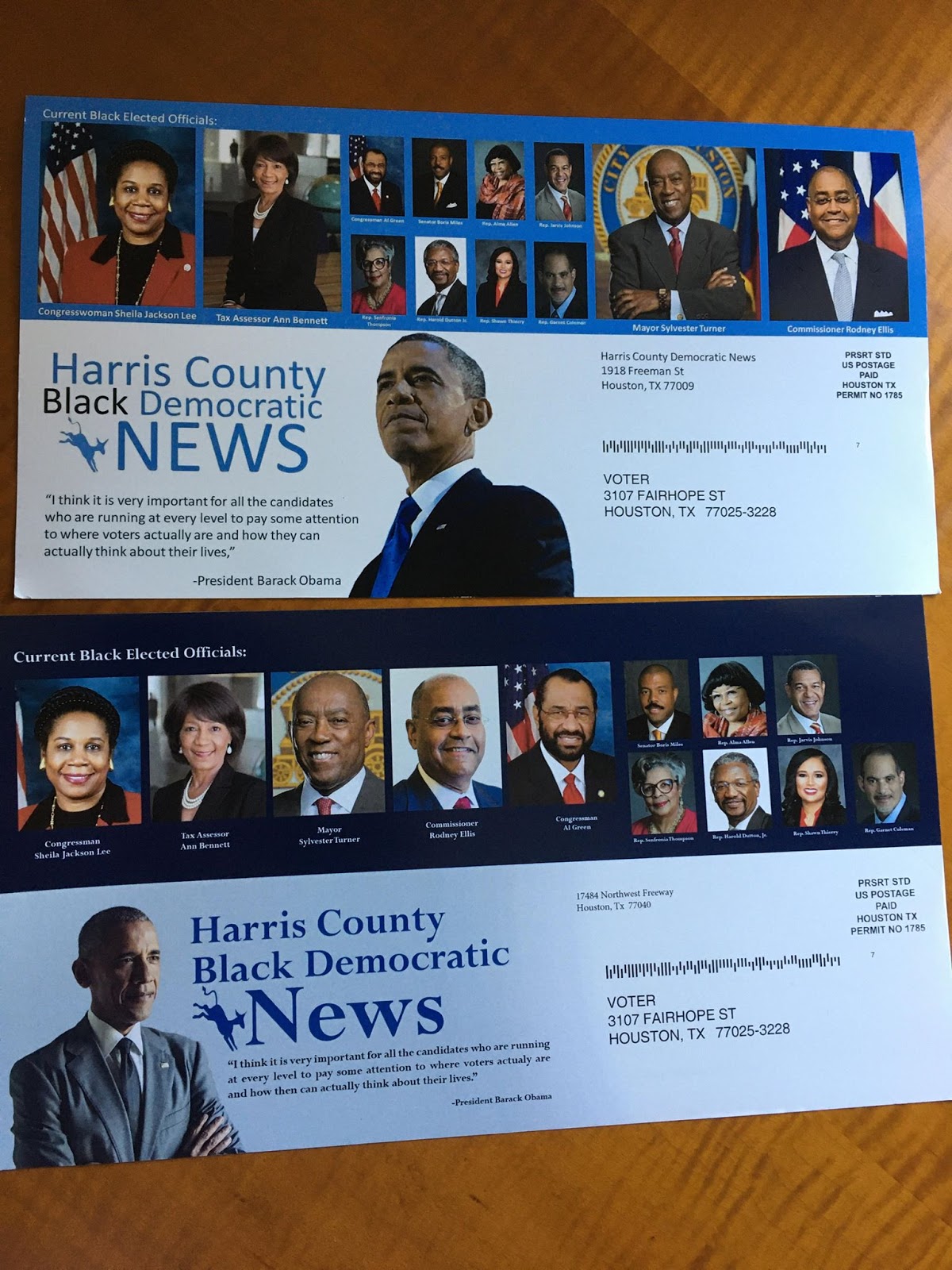 Once again Eric Dick has sent another round of his misleading campaign mailer. As with the last one, it features pictures of President Obama, Congresswoman Sheila Jackson Lee, Ann Bennett, and other local Black elected officials. On the back is a list of endorsements from a group called “Harris County Black Democratic News” a group, if it exists, is not associated with the Harris County Democratic Party.