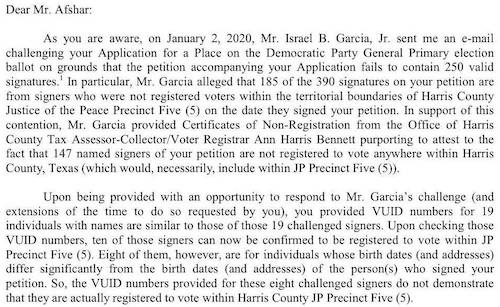 Yet he remained on the ballot receiving 21% of the vote and forcing a runoff. According to a letter from the party Afshar’s application had been questioned, specifically the names on his petition submitted to the party. In the end his application was rejected and he was provided an opportunity to file a timely appeal. From the letter: