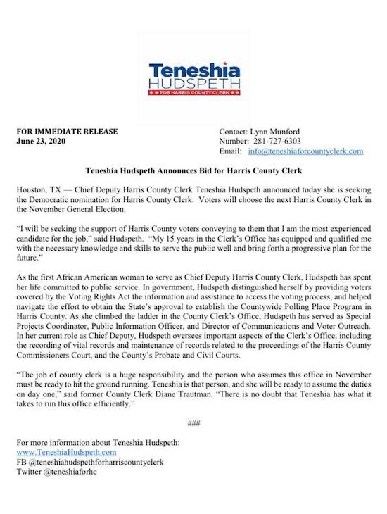 Teneshia Hudspeth the Chief Deputy Harris County Clerk has announced she is seeking the Democratic nomination for Harris County Clerk. I was hoping she was interested in running for this position. Diane Trautman had this to say: