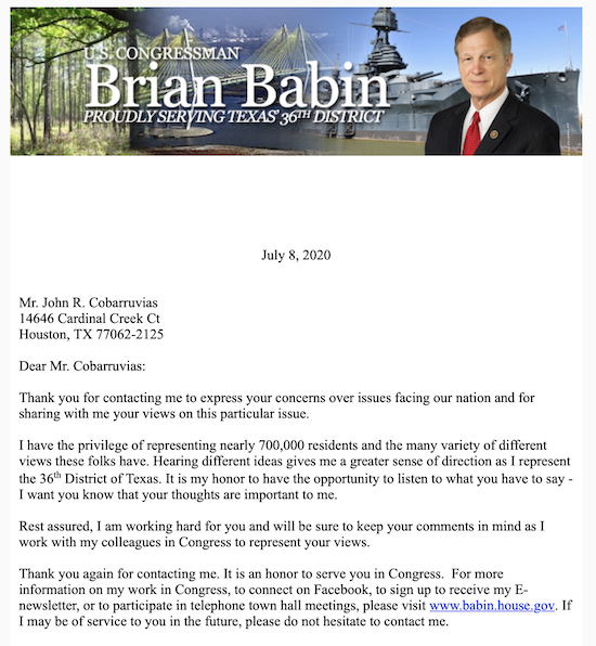 I finally received a generic form letter from Babin via email. It didn’t mention the bounties or Trump or anything really. So Babin is OK with trump and his response to Putin’s bounties. Babin is a veteran. He claims to “support the troops” but will hide behind the president when it is time to actually support them. Maybe he needs to take off his hood and smell the treason. From Babin: