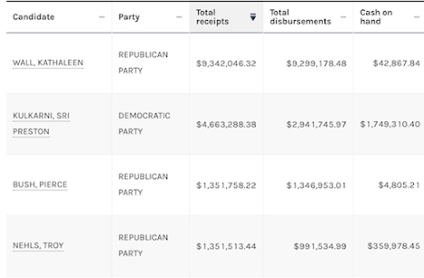 Sri has raised $4.6 Million compared to his challenger Troy Nehls who raised $1.3 Million. Sri has $1.7 Million cash on hand and Nehls has $360,000.
