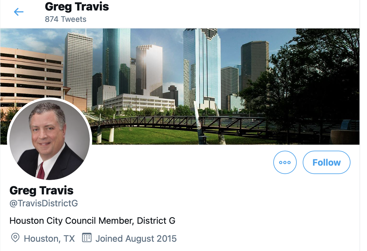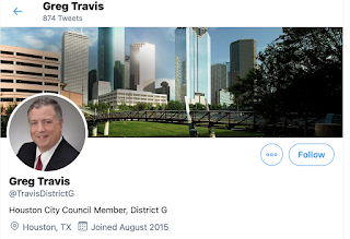 Travis is still under fire for posting a racist dog whistle on his twitter account, @TravisDistrictG. This account identifies him as a Houston City Councilman. It is not his personal account yet it is a combination of city business, COVID misinformation and right wing political commentary as well as inappropriate posts.
