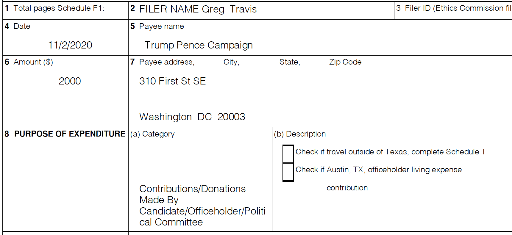 So, I was interested in what Greg Travis was spending his donors money on. In his end of year report for 2020 he spent $11,833. What was interesting was his $2000 donation to Trump/Pence campaign. So for those who are donating to Travis just be aware who your money might be going to.