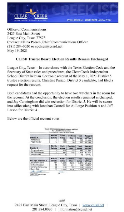 It's over. Qanon candidate for CCISD, Christine Parizo, loses recount.