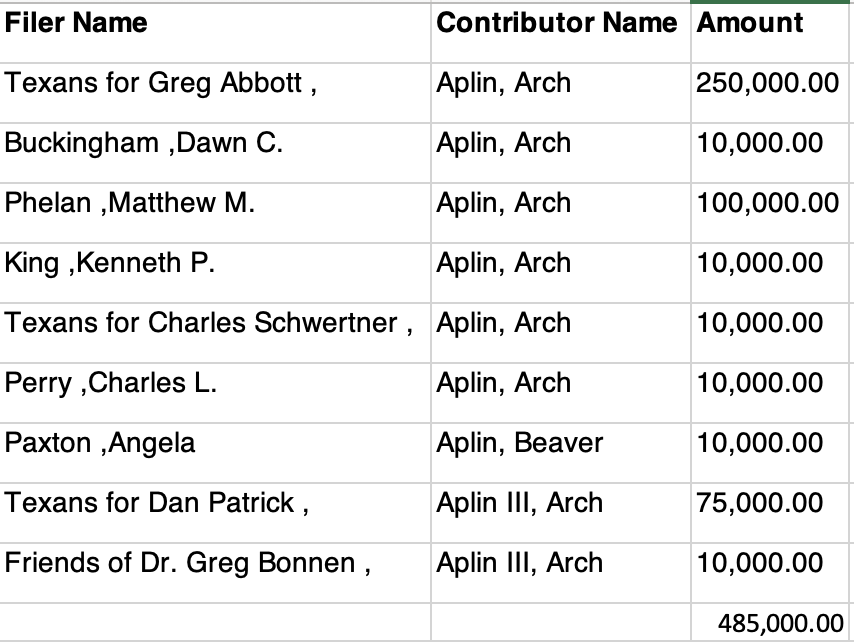 Aplin’s biggest donations went to Greg Abbott for $575,000 and Dan Patrick for $250,000.