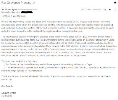 An official grievance has been filed against CCISD Trustee Scott Bowen for his conflict of interest in the past election resulting in a lawsuit by the loser against the winner, Jessica Cejka. For background: