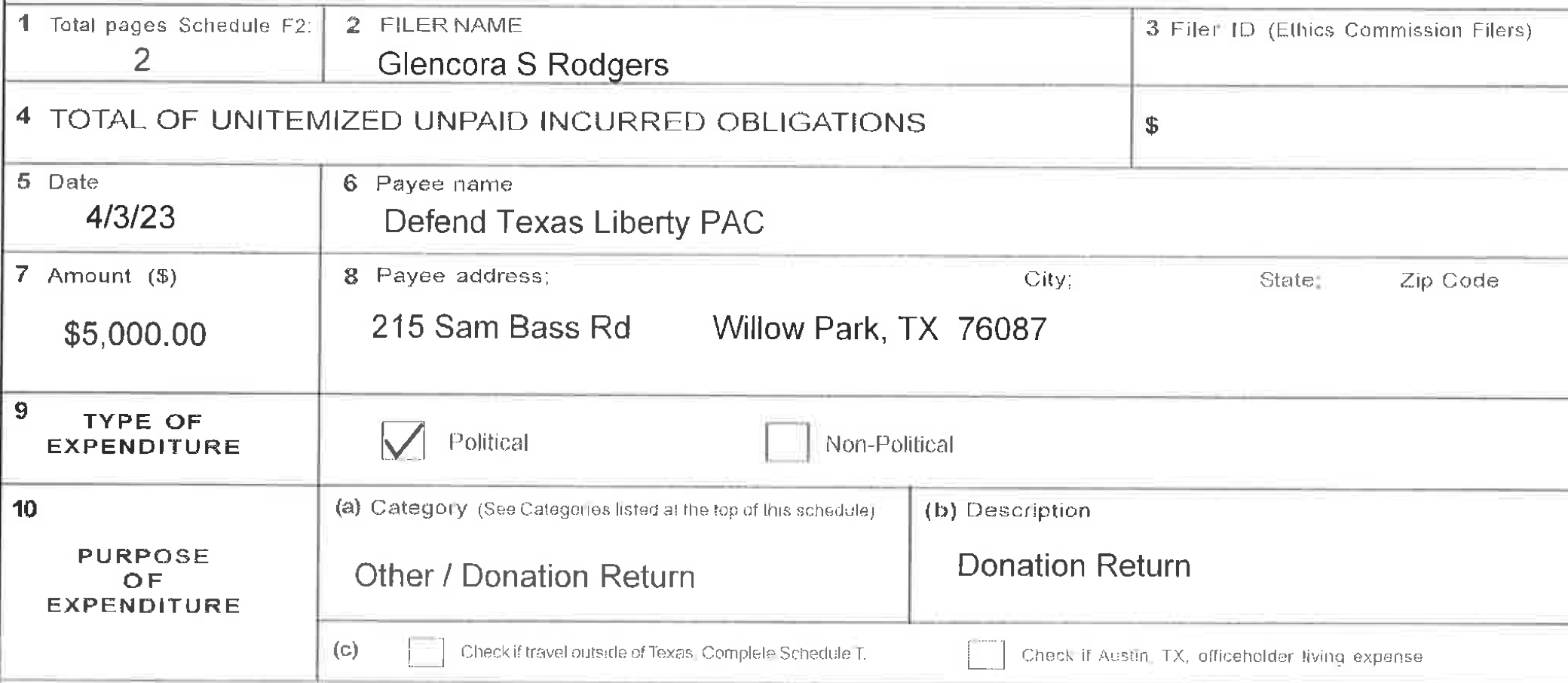 NOTE: Glencora Rodgers also received a donation from the Defend Texas Liberty PAC. She returned it.