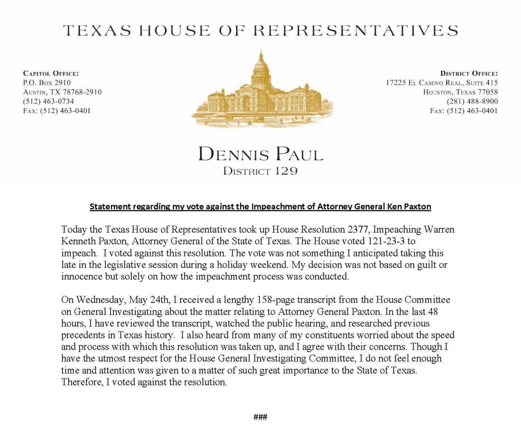 Paul claims in a statement, below, that the process was rushed which, if you read the transcript of the hearing of the Committee of General Investigating, is total bullshit. Paul is just repeating the talking points of the extreme far ignorant which included Democrat Harold Dutton. Impeachment in the House does not remove Paxton from office, but just last month after a two week investigation by the Committee, Paul voted to actually remove a member of the House, Representative Bryan Slaton for allegedly having sex with an intern among other things. That 16 page transcript is also posted.