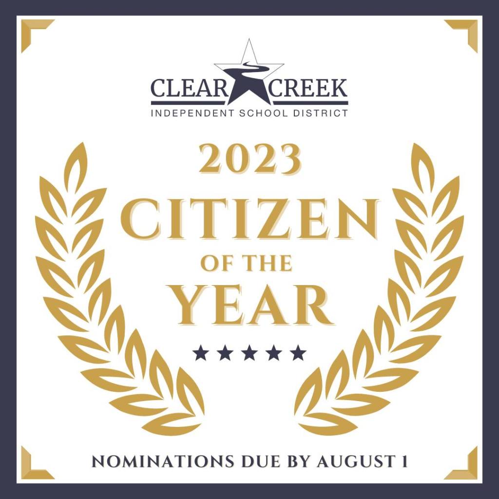 The CCISD Board of Trustees is seeking nominations for the 2023 Citizen of the Year! This distinguished award is presented each year to honor an outstanding member of the community who champions the school district and devotes their efforts to the betterment of public education. The recipient will be announced at the Clear Creek Education Foundation’s Annual Gala on November 9, 2023. Submit your nominations by August 1: http://bit.ly/43onqCZ