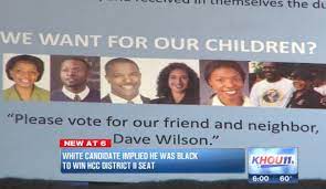 Dave Wilson wasn’t even in the pictures. It said that Ron Wilson, a Black State Representative, asked for voters to vote for Dave Wilson. Ron Wilson was actually Dave Wison’s cousin. In Iowa. Here is the mailer: