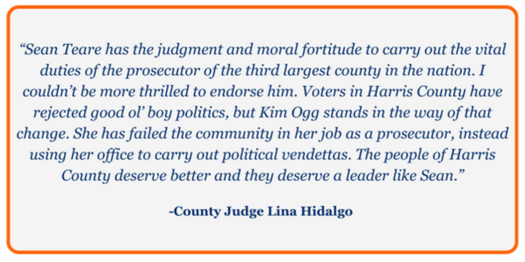Newsflash! Harris County Judge Lina Hidalgo does not like Harris County District Attorney Kim Ogg! I don’t know who is advising the Judge but she might want to consider a shake up in staff. This endorsement of Kim Ogg’s primary opponent, at this time, looks petty. It is appreciated, but it looks petty and in this day and age of politics looks, unfortunately, rules.