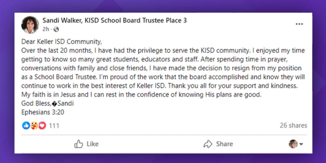 But it is a warning to all school districts. Keller Independent School District Trustee Sandi Walker resigned after serving just under two years. KISD is located just west of Fort Worth. What happened at an elementary school in KISD could happen elsewhere if the parents in the situation do not take strong, decisive action. BTW CCISD School Board and parents are more concerned about educating our kids than getting involved in this kind of crap.