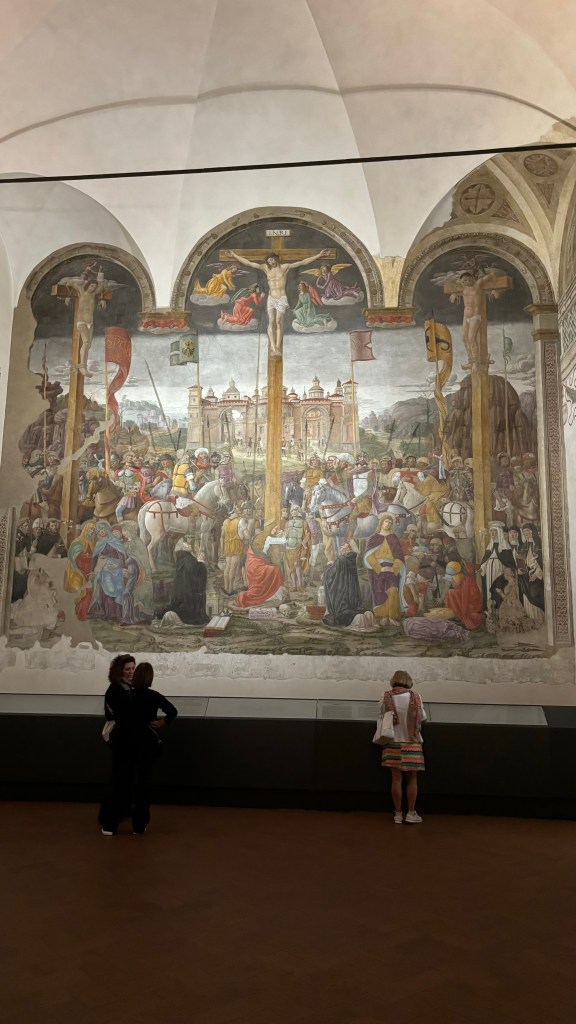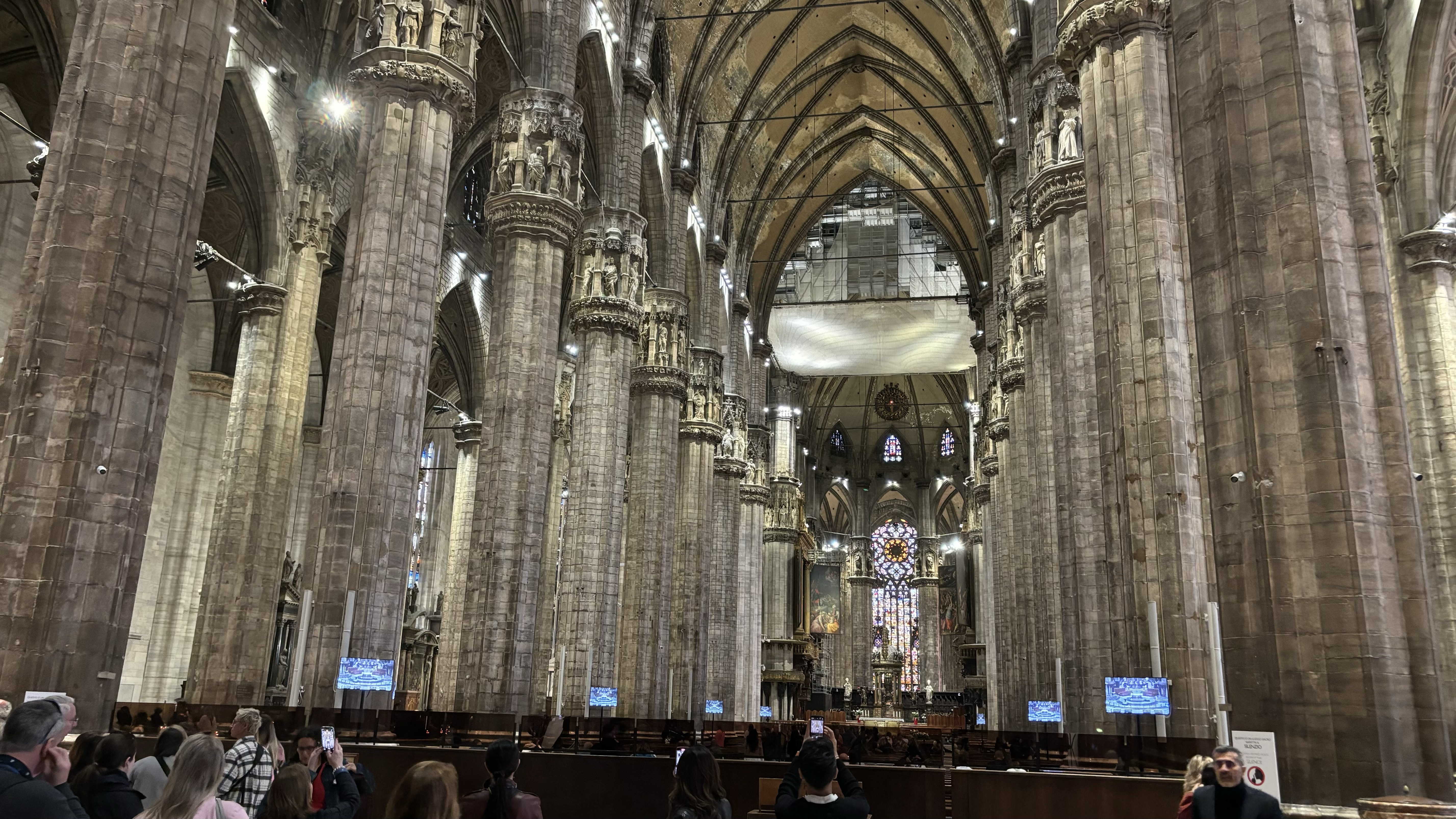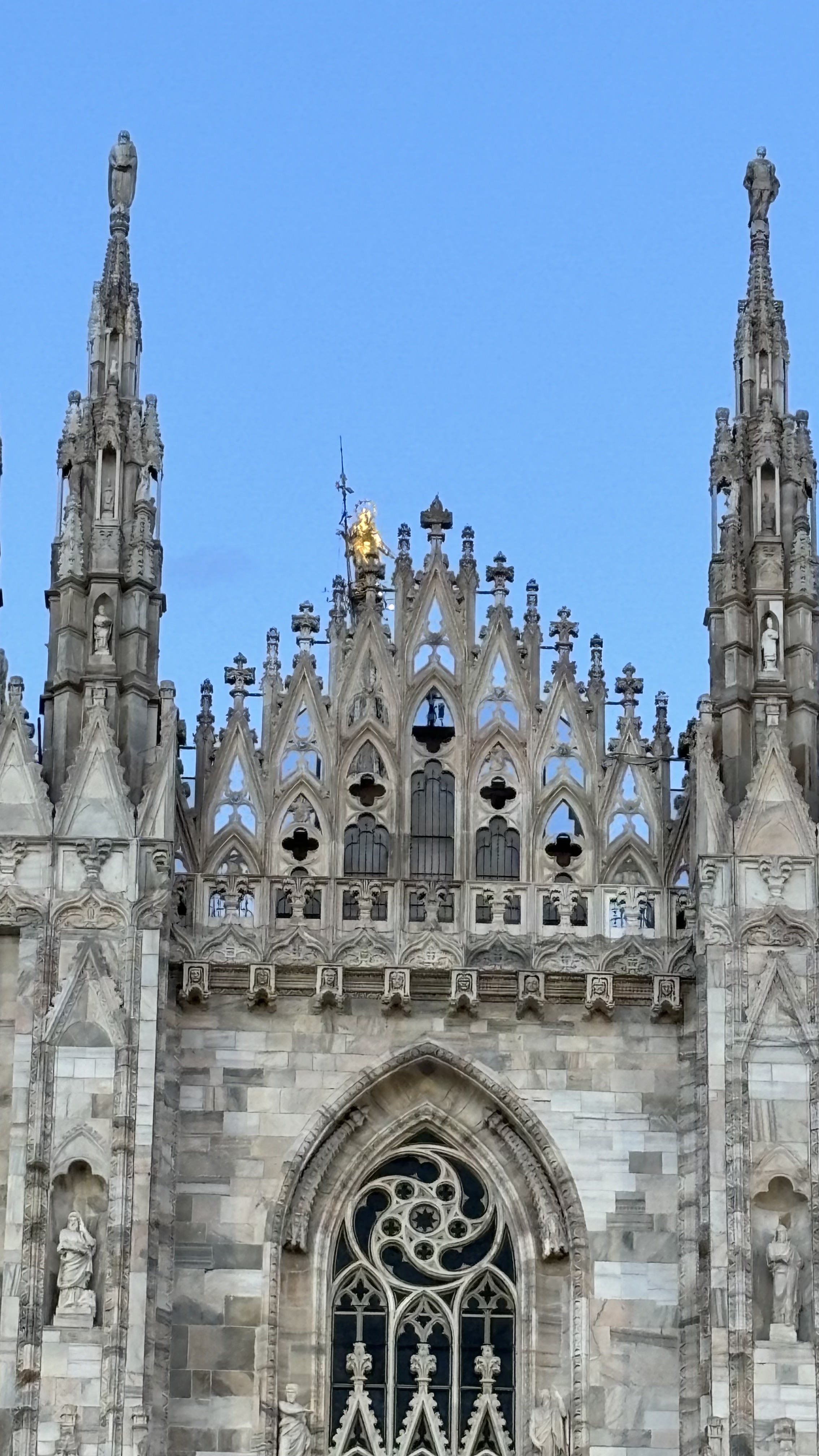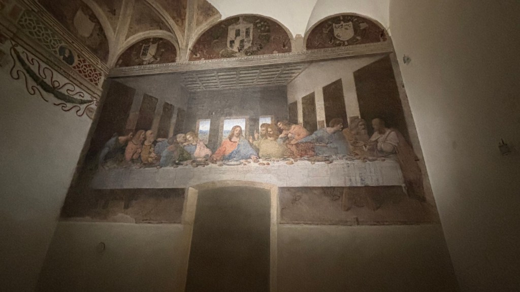 Milan. We stayed just around the corner from the Duomo di Milano. What a beautiful cathedral! Our tour through Milan included the painting of the Last Supper. That was interesting. The two paintings in the room were painted using different methods, fresco and dry. The dry painting of the Last Supper is faded and has required restoration. The other painting is pristine. Beautiful. Tourists are only allowed to be in the church for no more than 15 minutes.