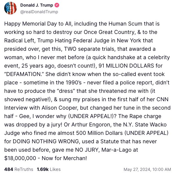 Veterans across the country took a break from their Memorial Day activities to come to the defense of the former President concerning his Truth Social post. Trump was highly criticized for his post starting with “Happy Memorial Day to All” then diving into a rambling mess, calling Americans including Veterans “Human Scum”.