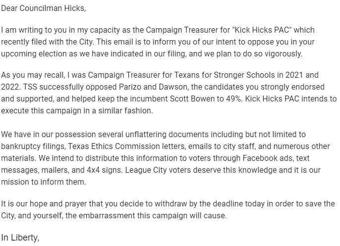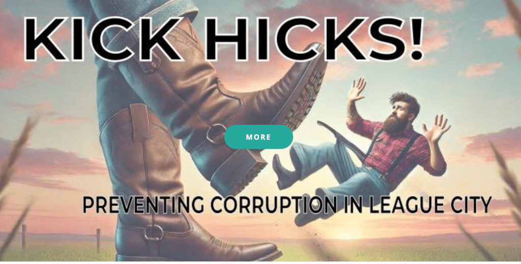 Hicks also has a PAC formed against him. The Kick Hicks PAC has notified him of the opposition to his campaign and asked him to withdraw to avoid the embarrassment. He didn’t. Hopefully League City voters will put kick Hicks out of office.