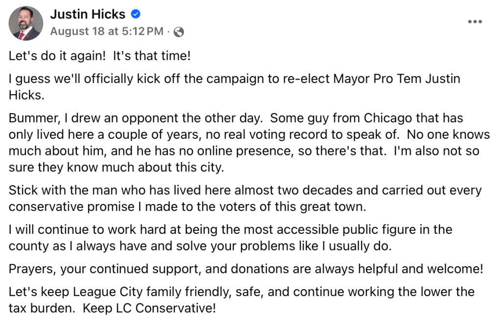 League City elections are set. Mayor Pro Tem Justin Hicks is whining.