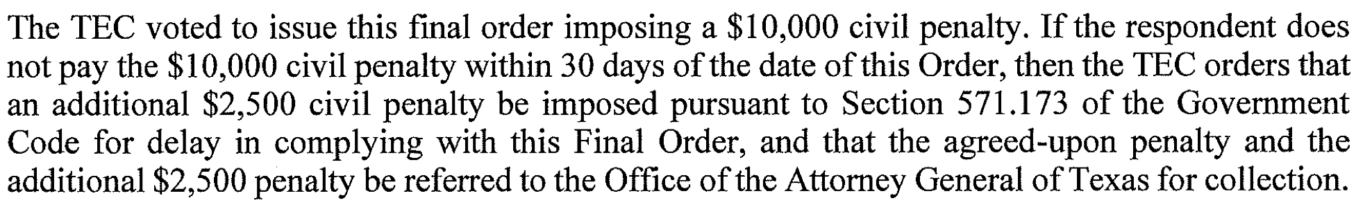 For this the TEC accessed a fine of $10,000 plus another $2500 if he didn’t pay it. The TEC will then send it to the Texas Attorney General for collections. Lucky for Avery the AG’s collection department will send a collection letter threatening a lawsuit if the fine is not paid in 10 days. Then they will do nothing. At all. He will get away with it.