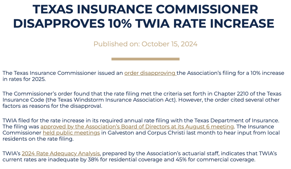 You can read the long winded 12 page details of why the modest 10% increase was denied on the TDI website. TWIA issued it’s own comment below:
