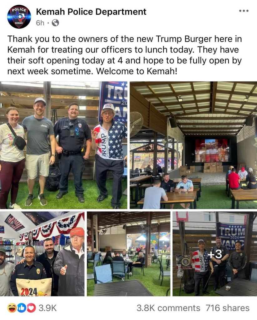 The Facebook page of the Kemah Police Department was proud to post a pic of their police at the soon to be opened trump burger welcoming them to Kemah. The officers seem to be very happy to stand with the cutout of Trump and standing next to someone wearing a trump shirt and throwing the White Power hand signal.