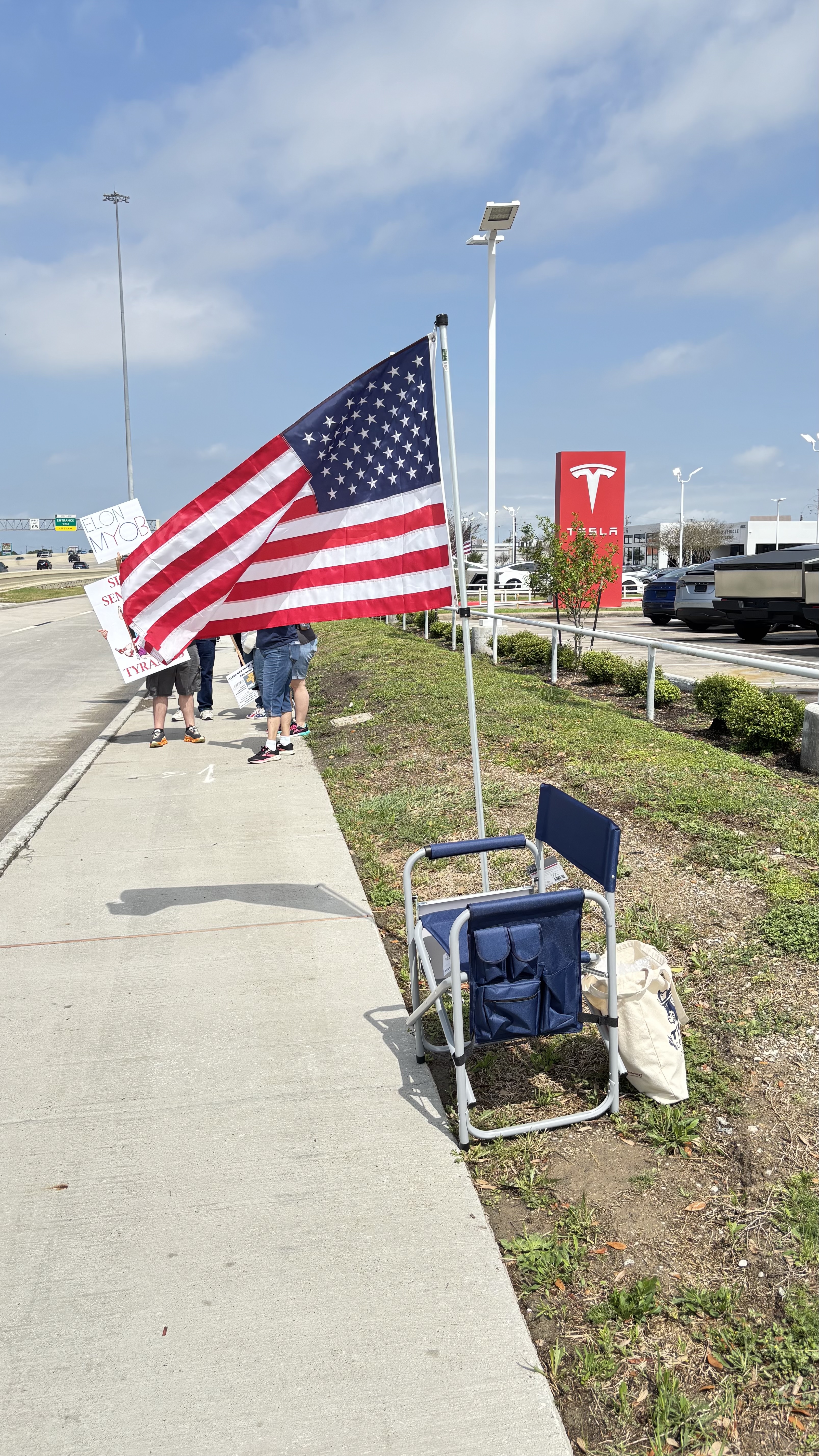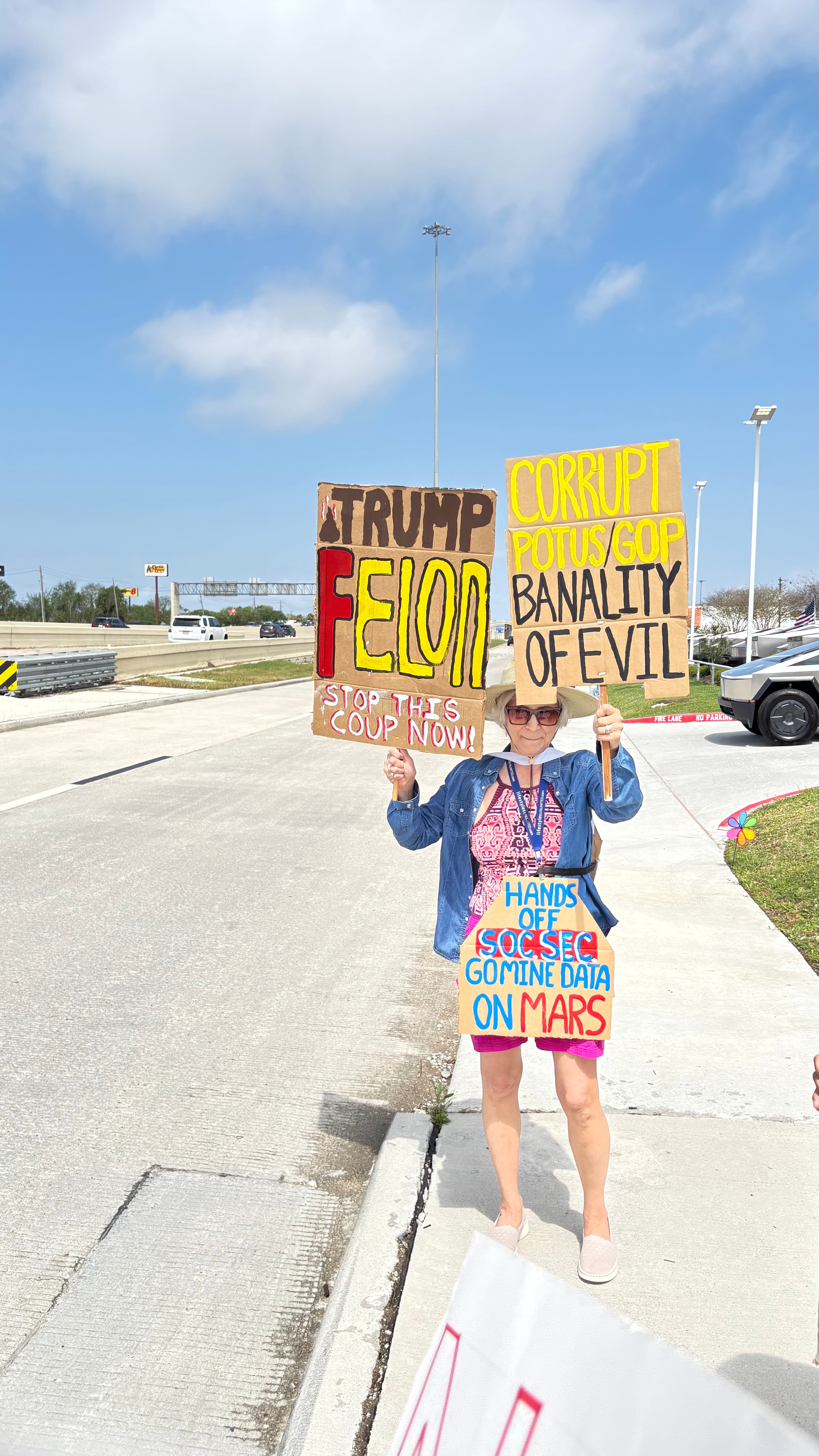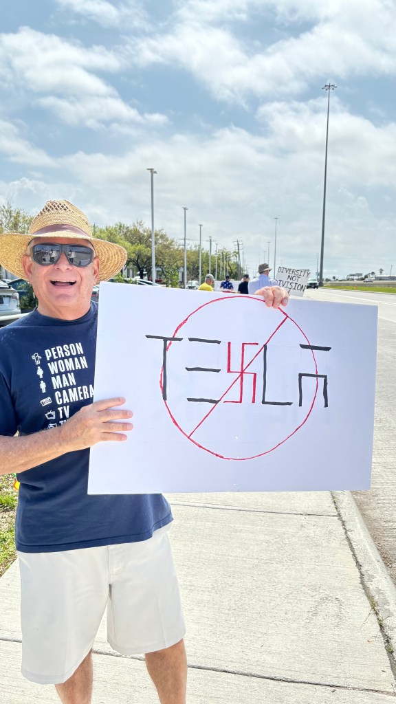 You can watch the coverage here and read about it in the Houston Chronicle. The protest was well received by people driving by and attracted 5 police vehicles. Even the police were supportive! There was only one Musk ass kisser that parked his truck in the Tesla parking lot. He was asked to move and did after we made fun of him. Another Trump Truck drove through the parking lot. He was also asked to leave. All in all a great turnout against NAZI Auto.