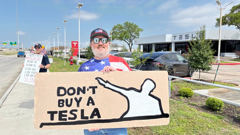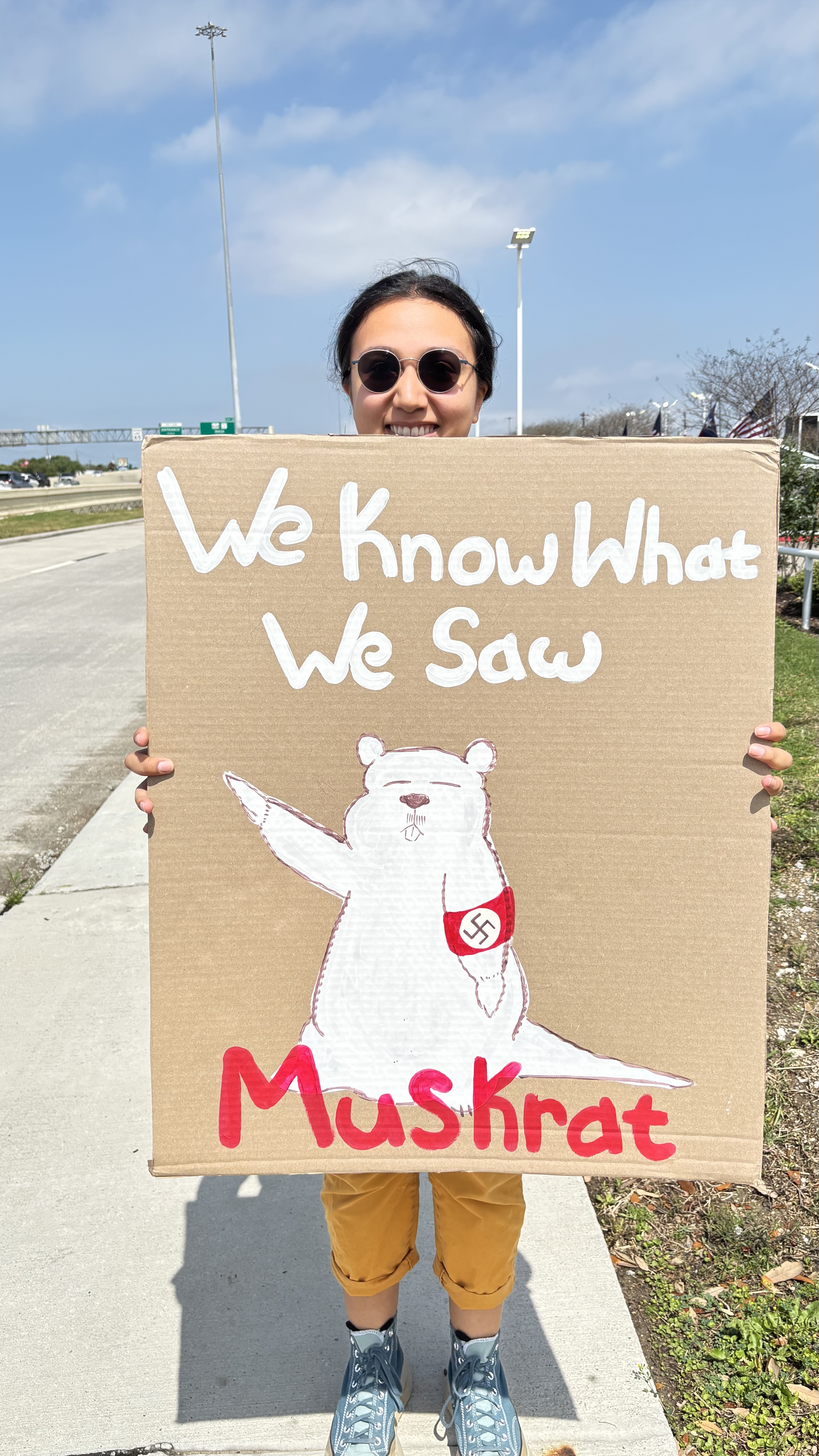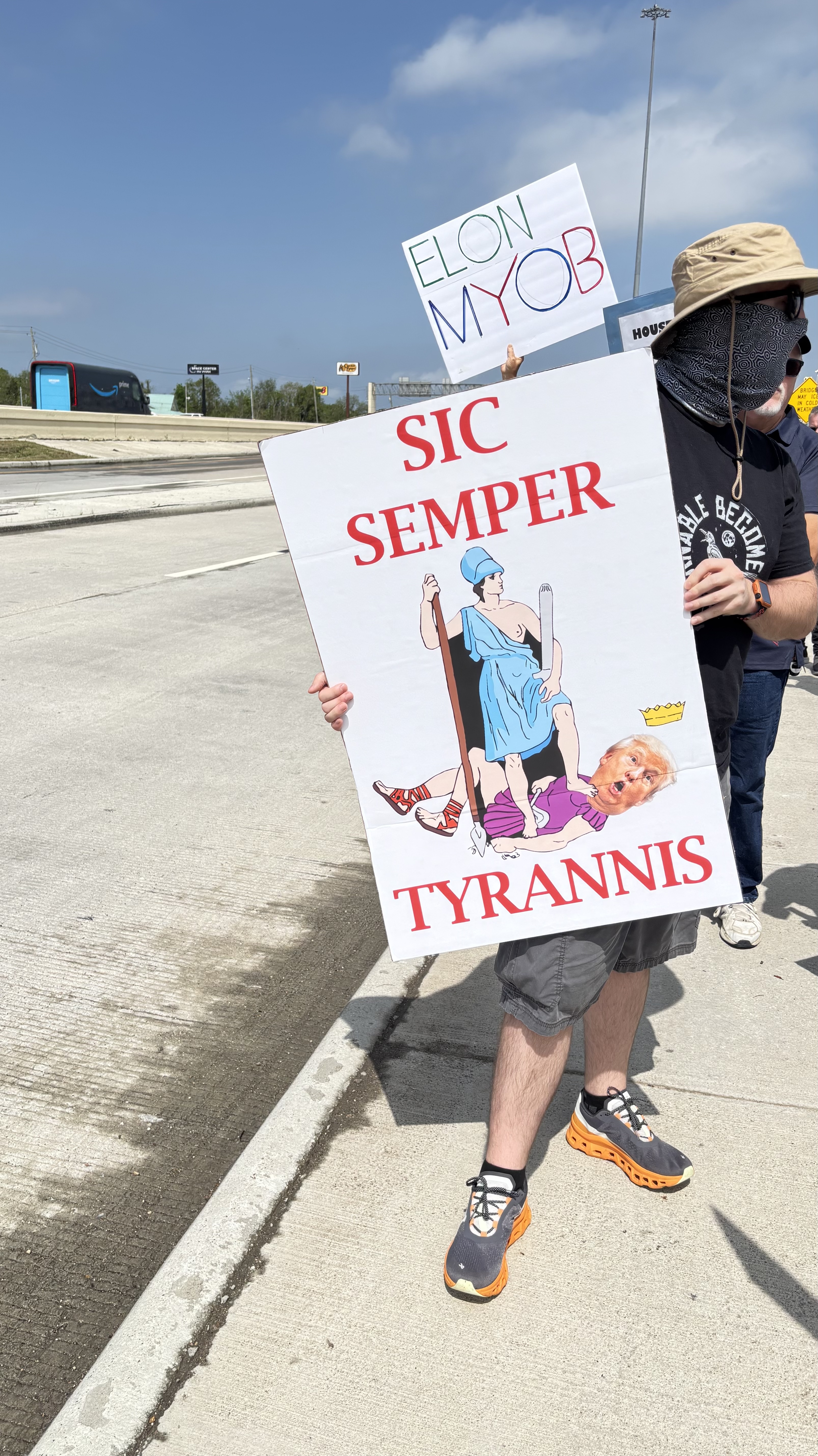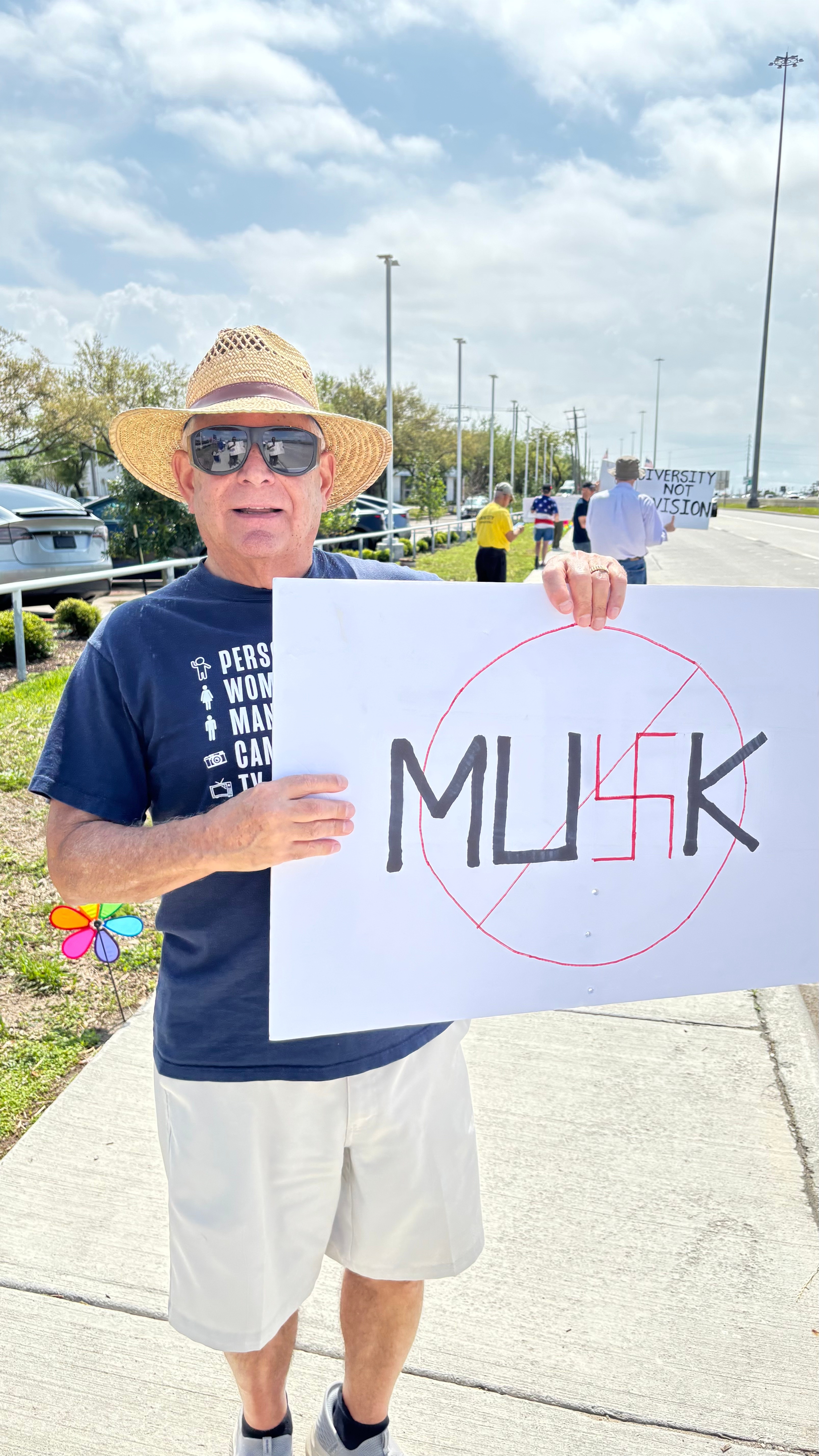 You can watch the coverage here and read about it in the Houston Chronicle. The protest was well received by people driving by and attracted 5 police vehicles. Even the police were supportive! There was only one Musk ass kisser that parked his truck in the Tesla parking lot. He was asked to move and did after we made fun of him. Another Trump Truck drove through the parking lot. He was also asked to leave. All in all a great turnout against NAZI Auto.