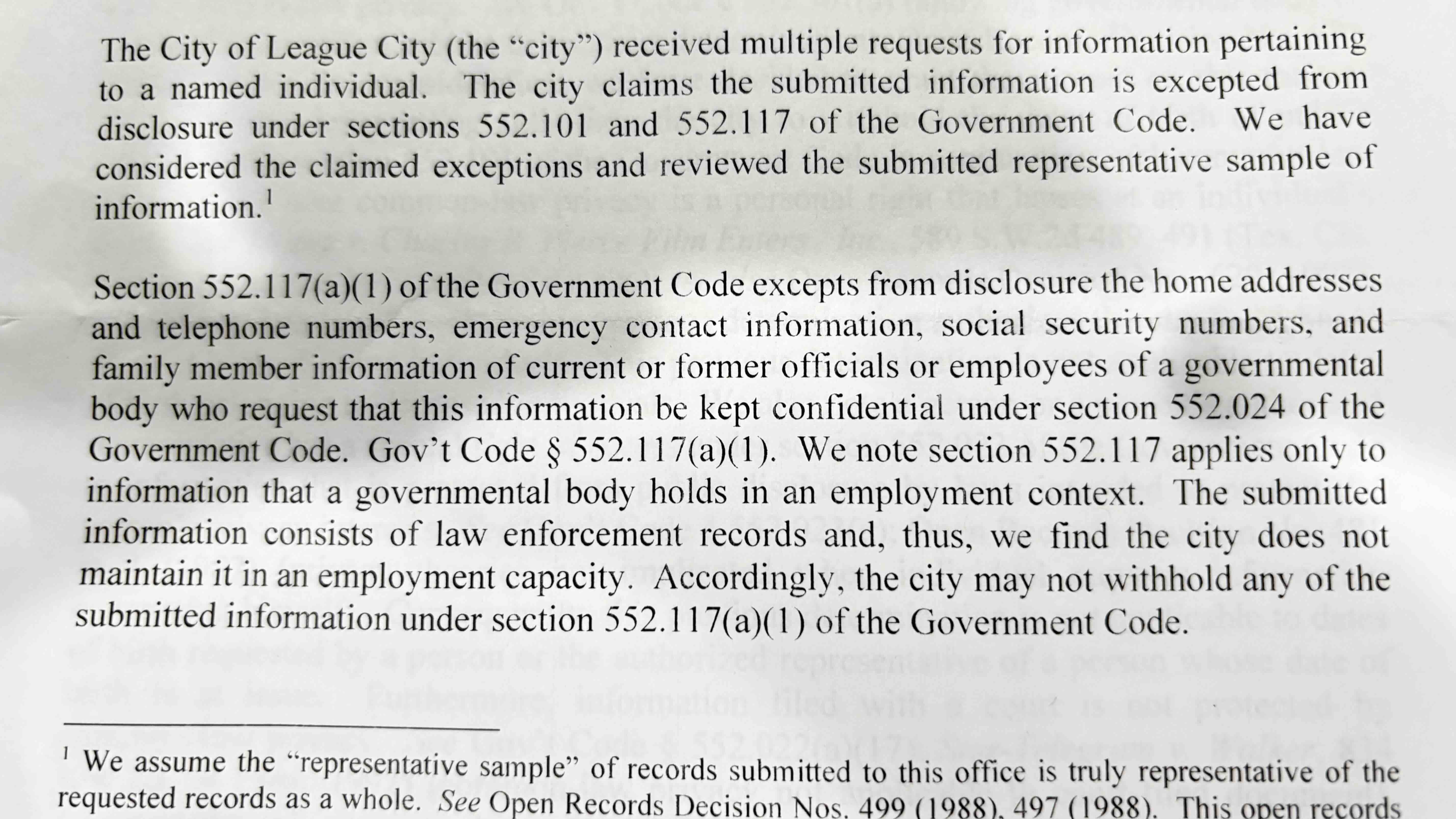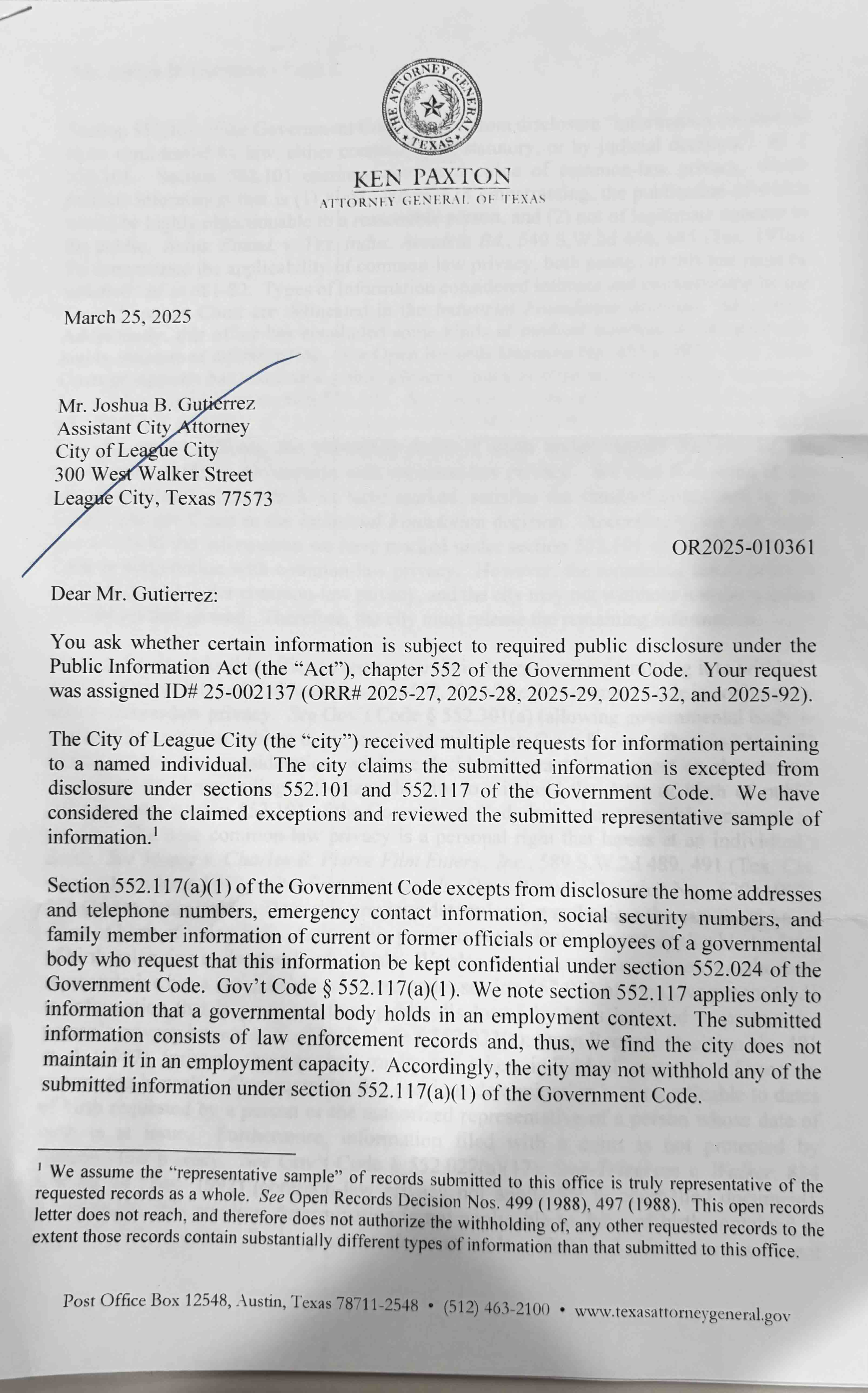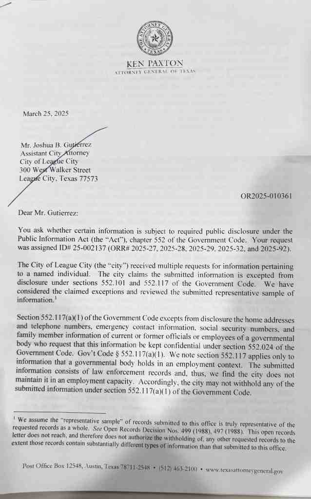 The League City Attorney asked for an opinion concerning releasing information about former City Council Member Justin Hicks. As you recall I45Now had requested information concerning a police event at the Hicks residence. Hicks asked the League City Attorney to suppress the records. This event eventually ended in Hicks resignation.