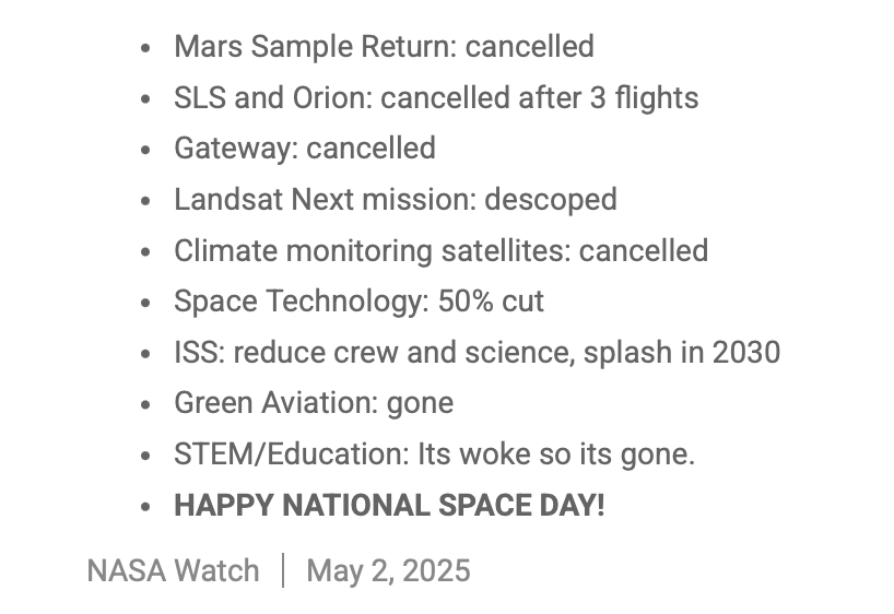 The right wingers of NASA at JSC went absolutely ballistic. At least one manager was “promoted” to staff after sending an email calling for voting Obama out of office. Others were clearly not happy. Some quit in disgust. Before Elon Musk became a dick the idea of using SpaceX vehicles became cool and was accepted by the NASA community. But now? Massive cuts to NASA are coming in the 2026 budget released by Trump. Most of that money will now go to Musk and SpaceX. Here are the highlights from NASAWatch: