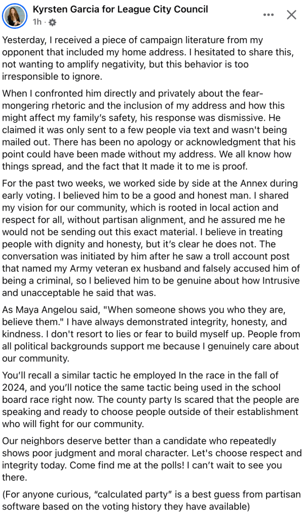 Wasn’t Justin Hicks enough for League City? Aren’t you tired of chaos, corruption, and cruelty? Aren’t you tired of the veiled threats by the extreme MAGAts of the Republic Party? Aren’t you starving for civility and elected leaders just doing their damn jobs? If so why in the living heck would you put Scott Higginbotham on Council?
