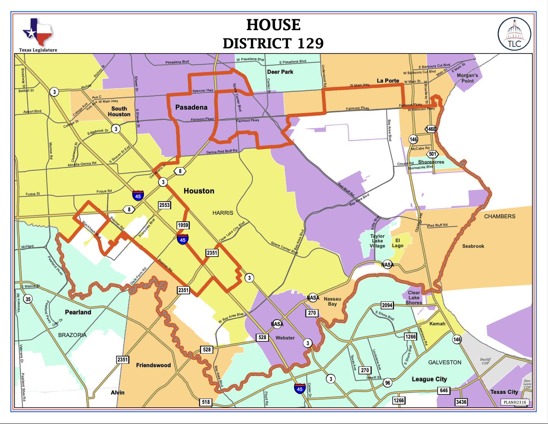 House District 129 (HD129) covers the Bay Area between Friendswood and Seabrook up to the border of Galveston County and extending upwards to almost Beltway 8. HD129 is mostly in Harris County and covers parts of Pearland, League City and Friendswood. Take a look at the map below. You can see the pdf version here and the street by street version here.
