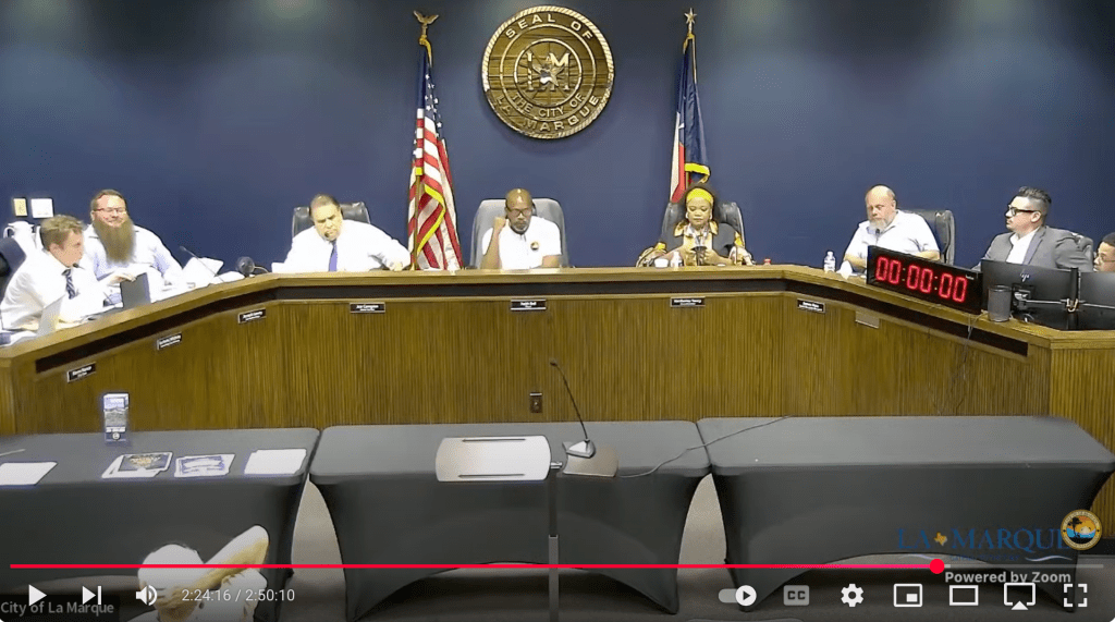 The City of La Marque has taken over the unfortunate side show of League City. I don’t believe any of the members of the city council are contributing to this show unlike what happened in League City with the book banning and other issues but they have to deal with it. The video of last nights meeting to address a censure of City Councilman Joseph Lowry wasn’t pretty. The segment starts at 1:51:48 and lasts for about an hour.
