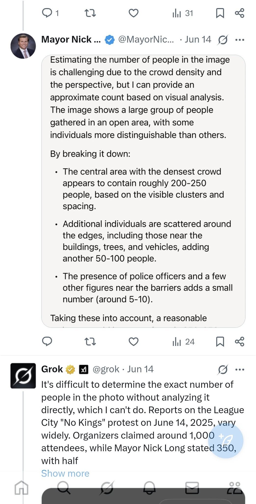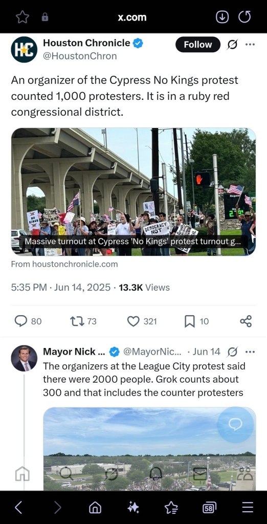 He claimed that Elon Musk’s AI app, Grok, estimated just 350. Grok and Elon are NAZI trash. Besides, why in the fuck would Long care? It was a successful and peaceful protest. No one brought guns. No one stormed city hall. No one beat up or killed a cop. No one was flying NAZI or Confederate flags. League City received praise for all of this from the Galveston Daily News. All Long should have done was take credit for it, thank the protestors and the police, and go do something more productive like picking on the Gay Community. Again.