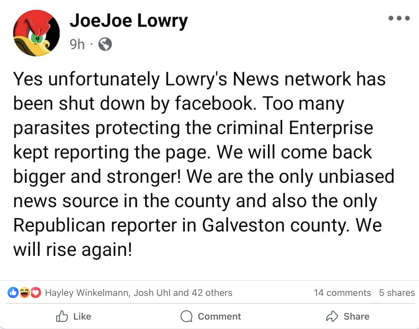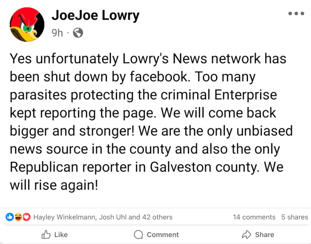 Lowry’s other personal Facebook pages and user IDs are also gone. His recently created account, JoJo Lowry, is gone. What happened that required his pages to be removed is not known but Lowry has been neutered. He has lost his voice. Maybe his attorney told him to remove everything since he is being sued by multiple people in Galveston County case # 24-CV-2218. Or maybe the City has recommended that he removes his pages due to legal issues against the city. Or maybe Facebook was subpoenaed by the various lawyers suing Lowry.
