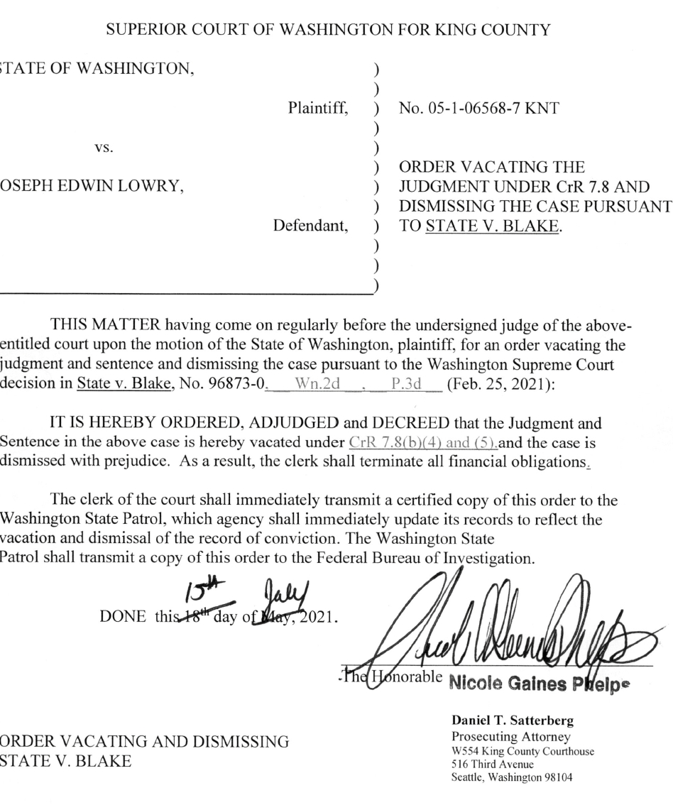 Vacating the conviction. 16 years later the Washington State Supreme Court in State v. Blake, found the state’s felony drug possession statute unconstitutional. Based upon this ruling Lowry petitioned the court to vacate his conviction. According to google: