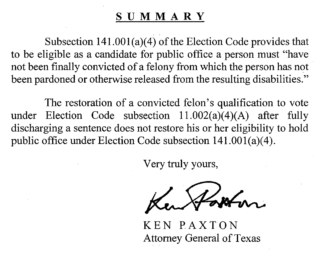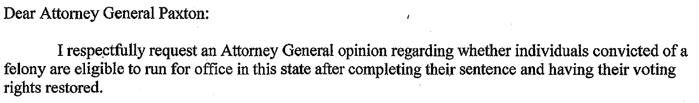 One Response to Texas Attorney General’s Opinion Concerning Felons Running for Office