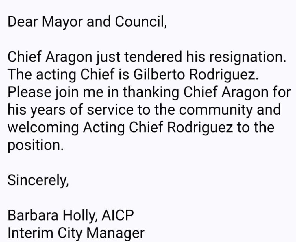 Last Monday’s City Council meeting might have been the start of the end of Police Chief Aragon but yesterday’s phone call was probably what ended the end. At about 3:00 PM the Chief made a call to Hayley Winkleman. Hayley has been an outspoken critic of Aragon and spoke at the Council Meeting. A couple of hours later the City Manager alerted the Council that Aragon had tendered his resignation.