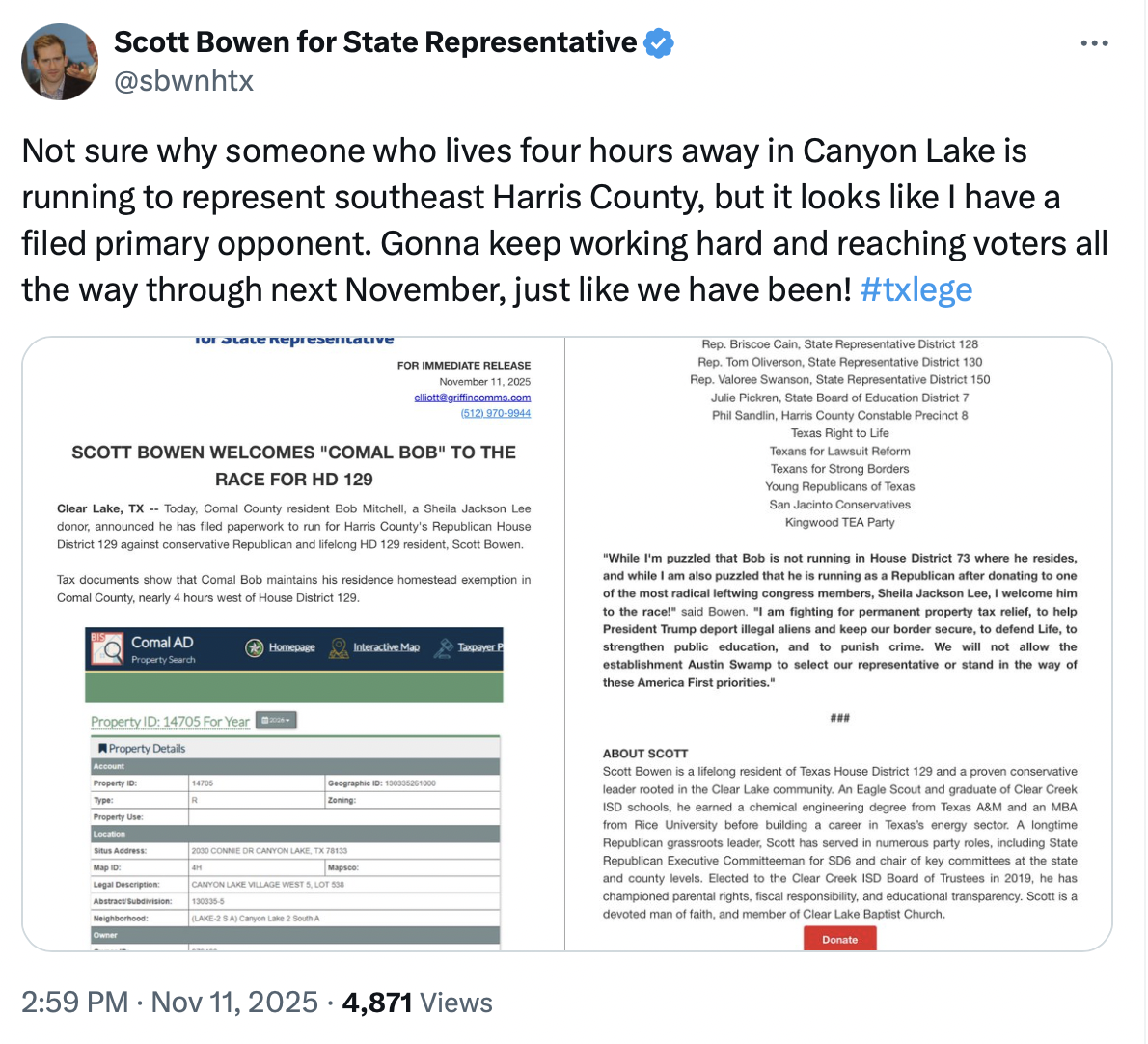 The former CCISD Trustee who was ousted in 2024 by a conservative republican has brought out his nails in the race for House District 129 GOP primary. Not quite sure why the nails have to be sharpened or used. Scott is the darling of the Republican Party. He has lots of endorsements by the extremists of the Party including Little Baby Briscoe Cain and Money Mayes Middleton. Even Greg Abbott has endorsed him, although his endorsement didn’t help Bowen’s recruited candidates in CFISD. They got wiped out. I’m just waiting for Bowen to accept the endorsement from a suspected pedophile.
