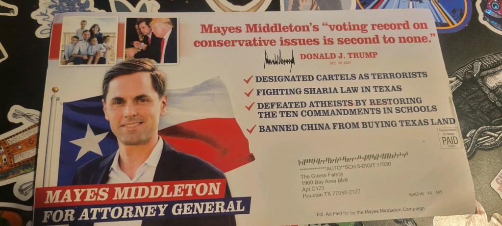 It’s clear Middleton will carry the torch for Ken Paxton and kiss Trump’s ass when it comes to conservative issues like kidnapping Mexicans, pardoning felons, bashing the gay community, and furthering his Christian Nationalist ideology on the people of Texas.