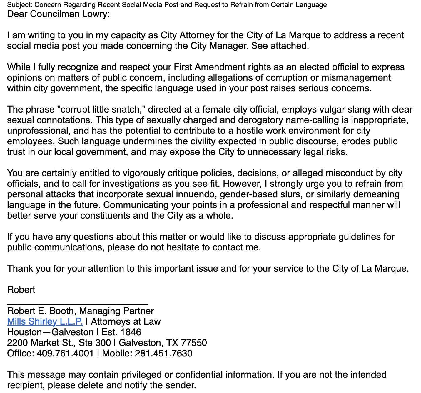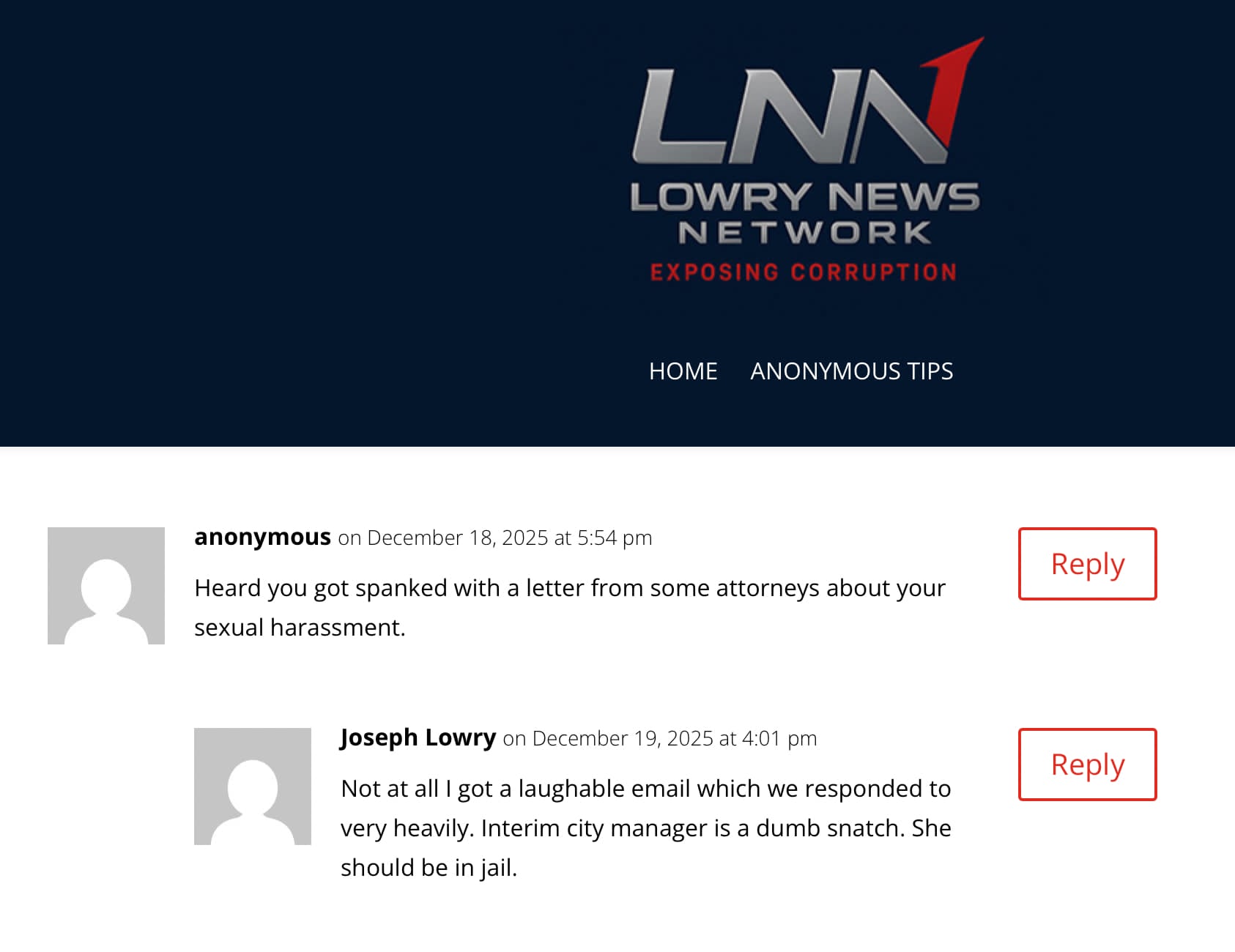 Well it turns out that the law firm representing the city sent Lowry an email with a warning to stop making sexual harassment statements against the City Manager. Here is a snippet: