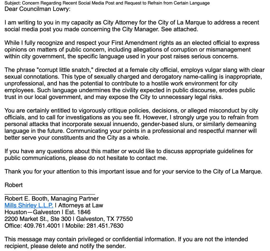 Law Firm Issues Warning to La Marque City Councilman Concerning Sexual Harassment