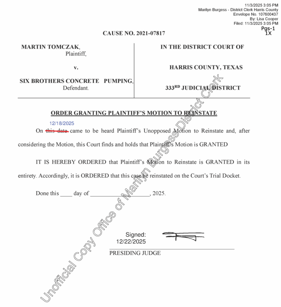 As reported earlier Civil Case #202107817 TOMCZAK, MARTIN vs. SIX BROTHERS CONCRETE PUMPING LLC filed in Harris County was “Dismissed for Want of Prosecution. From what I read the plaintiff was unable to attend a hearing because of technical difficulties. A motion was filed and granted to reinstate the suit against Councilman Joseph Lowry the owner of Six Brothers Concrete.