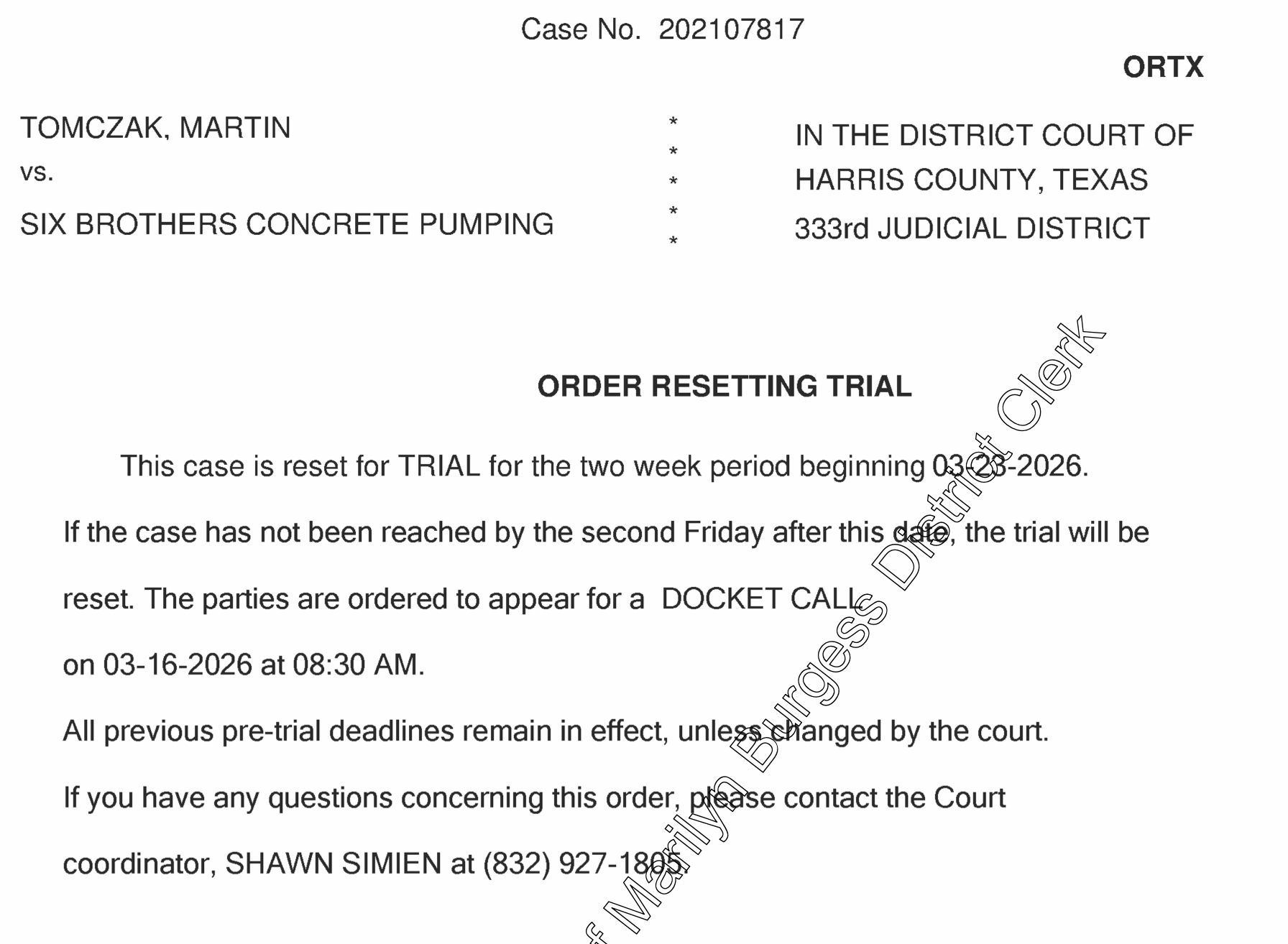 The Civil Case #202107817 TOMCZAK, MARTIN vs. SIX BROTHERS CONCRETE PUMPING LLC filed in Harris County concerns a non compete clause signed by Martin Tomczak. According to the court documents Martin claims Lowry threatened him and potential employers with lawsuits based upon this non compete document leaving Tomczak unemployed. One of the documents submitted to the court is a list of texts and correspondence from Lowry. You can read the entire 27 pages here.