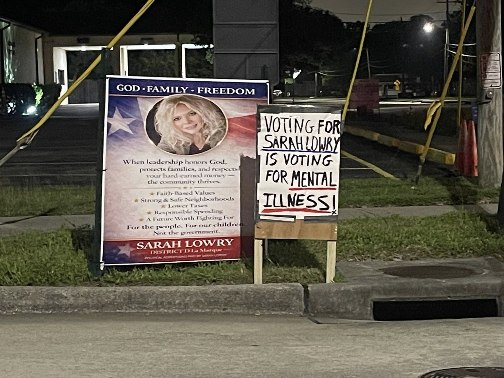 Lowry hasn’t filed but has spent money on some of the worst campaign signs ever made in direct violation of Campaign Signs 101. Besides have a gawd awful sign the citizens of La Marque need stability and restored faith in their government. Lowry will just bring more chaos to the Council sitting next to her fucked up husband, Joseph Lowry. Joseph should be run out of office and Sarah should not be running for office. Both are not qualified to represent the citizens of La Marque and both are just filthy human beings. Her running on god, faith, and family is just fucked up.