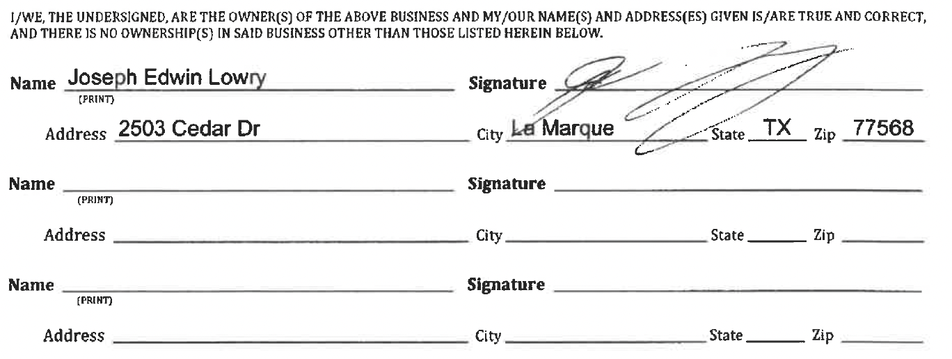 Filing fake DBA’s. In October of 2025 I wrote “La Marque Councilman Files Suspicious DBAs” about Joseph Lowry filing an official county document “Assumed Name Record Certificate of Ownership for Unincorporated Business or Profession”, in other words, a DBA (Doing Business As). He filed two DBA’s. One under K Yancy (as in Councilman Kimberly Yancy) and one under M Salazar (as in Mandalynn Salazar). He filed both of these on 2/24/22. Lowry has a history of harassing both of these individuals.
